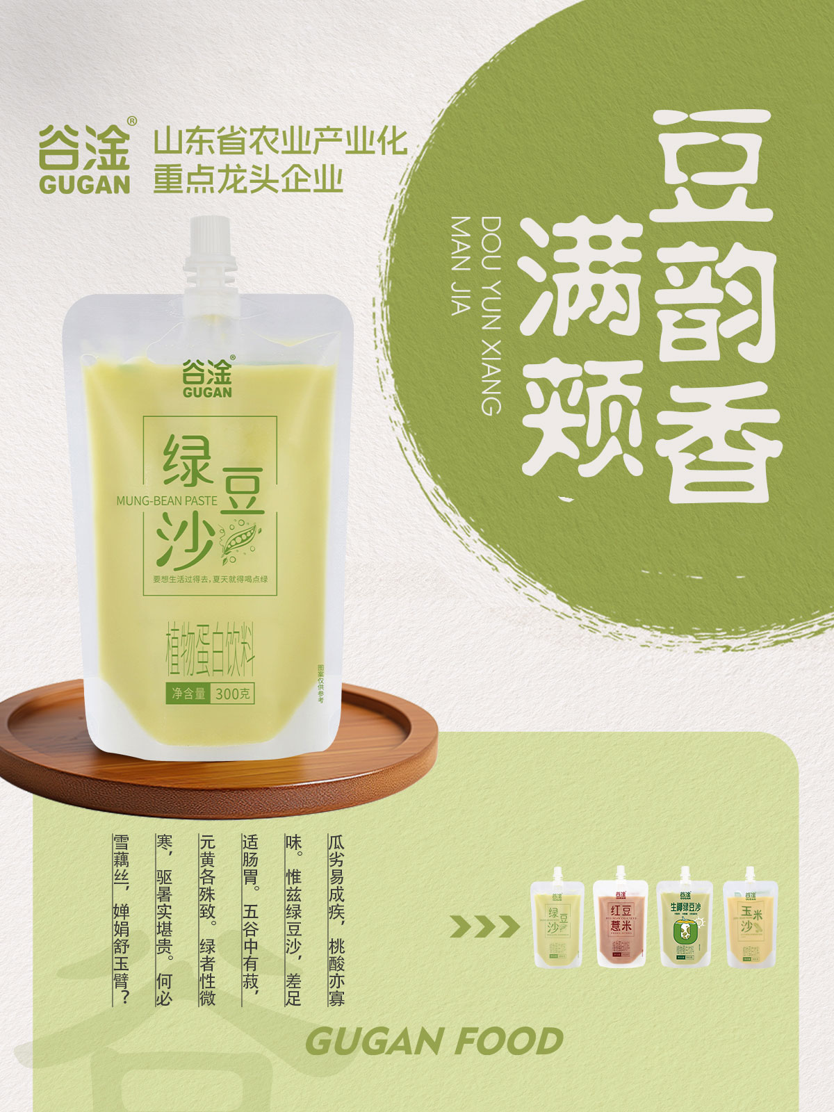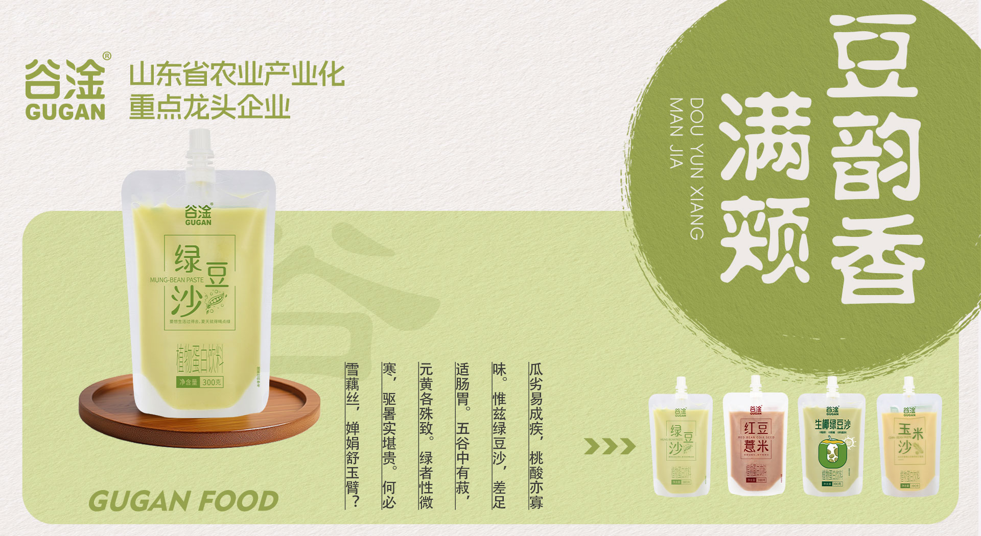 山東谷淦食品有限公司總部位于山東省淄博市,是一家集生態(tài)化農業種植、中草藥種植、農副產品加工、商貿物流、營銷服務于一體的農業產業化省級重點龍頭企業,從生產到終端,構建農工商高度融合、一二三產業相互支撐的現代化經營體系。集團公司主要產品包括谷物飲料、植物蛋白飲料、八寶粥、奶昔及果汁飲料、中式養生飲品等系列方便食品,旗下擁有“谷淦”、“福粥來”、“頤慕”、“甘噸噸”、“妃生元”、“植豆說”等眾多品牌。